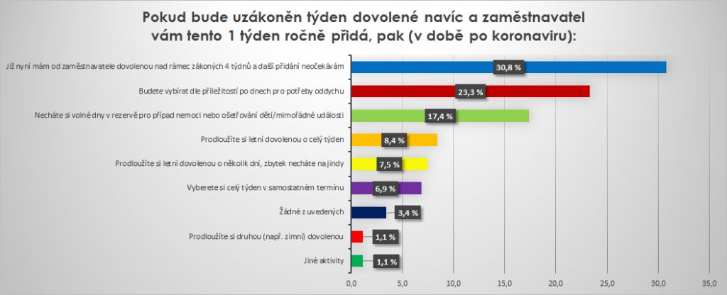 Pokud zákonná změna bude schválena, pak se na delší dovolenou než doposud mohou těšit zaměstnanci nejméně pětatřiceti procent českých firem. K třiceti procentům společností, kde by změnu zařídili zákonodárci, by totiž přibyly ještě další, které zaměstnancům chtějí přidávat nové dny navíc formou benefitu. Pevně rozhodnuto takto pracovníkům přilepšit je nyní necelých pět procent společností, 43 procent žádané dny přidávat nebude a zbylá nadpoloviční většina (52 procent) to bude řešit až bude otázka aktuální.