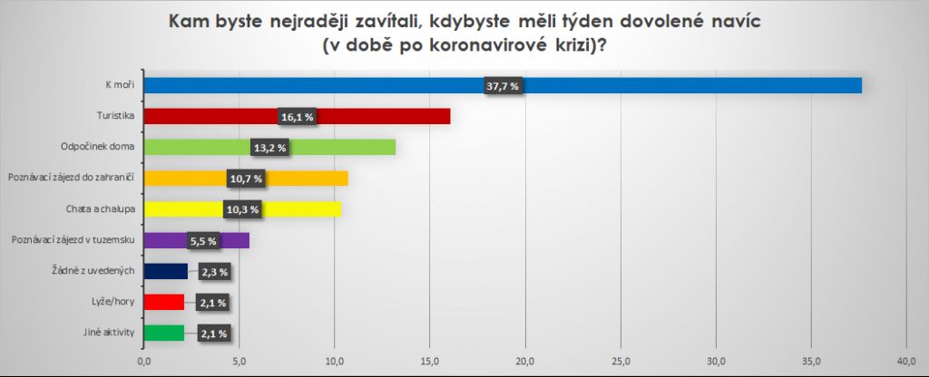 Zajímavostí jsou i rozdílné představy trávení případné přidané dovolené. Ženy by o poznání raději než muži (46 %, ve srovnání s 31 %) jeli k moři, muži zase více fandí turistice, jak vyplývá z průzkumu. Mnoho lidí by ale také volilo možnost nechat si dny nového volna pro případ náhlých událostí, nebo by se rozhodovalo dle aktuální situace a možností.