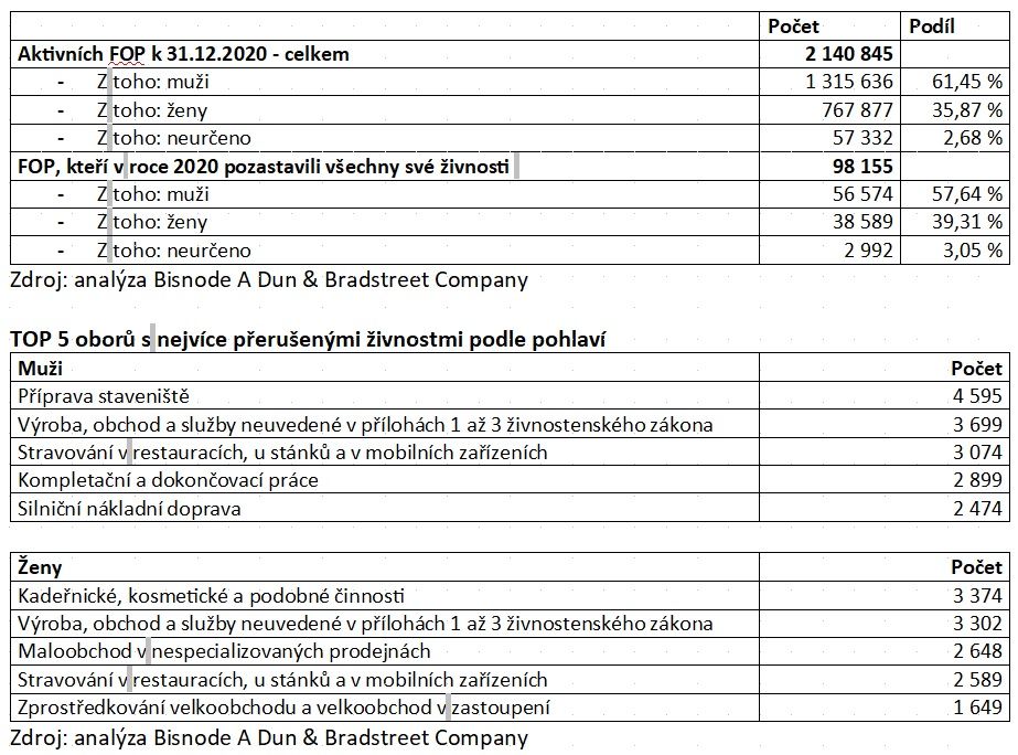 Ke konci loňského roku bylo v ČR registrováno přes 2 140 000 živnostníků, z toho 61 % mužů a 36 % žen. Podnikání přitom pozastavilo téměř sto tisíc živnostníků. „V přepočtu na podnikatelskou základnu to znamená, že přerušit podnikání se rozhodl každý dvacátý druhý živnostník,“ říká analytička Bisnode A Dun & Bradstreet Company, Petra Štěpánová s tím, že počet žen vztažený k jejich celkovému počtu byl téměř o jeden procentní bod vyšší. Všechna živnostenská oprávnění přerušilo 5,03 % žen a 4,30 % mužů. „To může souviset také s opakovaným zavřením škol, když se ženy, zejména matky mladších dětí, rozhodly raději pečovat o své potomky,“ uzavřela Petra Štěpánová.