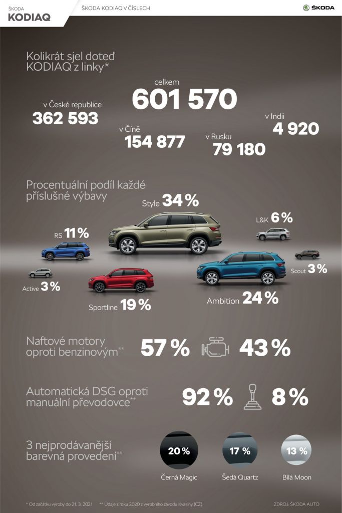Čtyři roky po zahájení SUV ofenzívy prochází světově úspěšné SUV ŠKODA KODIAQ modernizací. Vůz, který může být na přání konfigurován jako sedmimístný, má modernizovaný emocionální vzhled. Vylepšeny byly i jeho aerodynamické vlastnosti. Poprvé nabízí KODIAQ inovativní Matrix-LED přední světlomety. Sportovní vrcholný model KODIAQ RS má kromě vylepšeného vzhledu i nový, výkonnější motor TSI. Modernizovaný KODIAQ bude dostupný od července 2021.