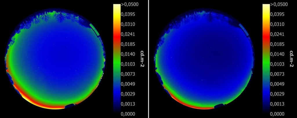 „Kulaté snímky z rybího oka nám ukazují pohled na zenit, a tedy celou horní hemisféru. Zde máme velmi zajímavá čísla z výpočtu osvětlenosti způsobené málo jasnou oblohou. V místě měření bylo pouhých 0,008 lx intenzity osvětlení při vypnutém veřejném osvětlení. To je hodnota asi třicetkrát menší, než bychom naměřili při velmi jasném úplňku,“ upozorňuje Baxant na to, že do měření může zasáhnout právě i jasný Měsíc. Ve výzkumu jeho týmu pomáhá jimi sestrojený jasový analyzátor, který dovoluje Měsíc a jeho jas odečíst a nahradit pozadím. Běžný luxmetr takové měření neumožňuje. V době sobotního měření ale Měsíc nebyl vidět.