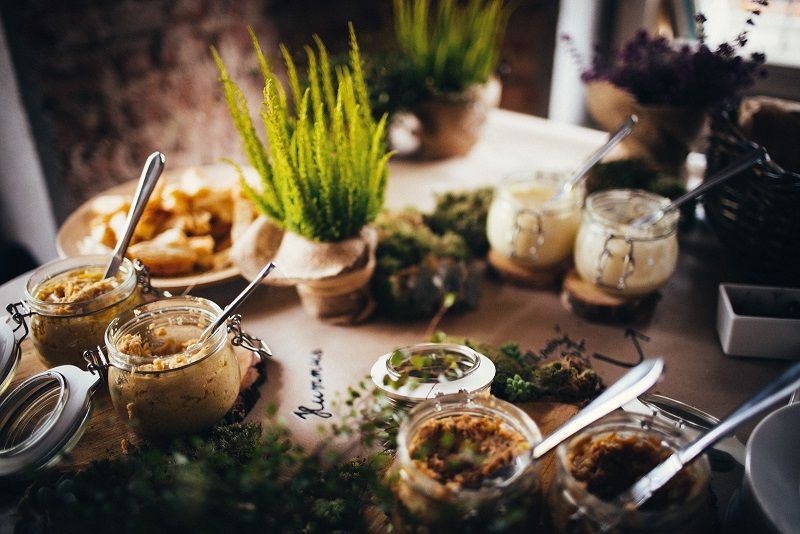 Vybírejte lokální a sezónní suroviny, dejte větší prostor rostlinné stravě. Cukroví si nechte připravit třeba v sociálním podniku ve svém okolí. Z hlediska bezpečí a zdraví účastníků se vyhněte “otevřenému rautu”. Nápaditý a lahodný raut můžete servírovat ve stylových zavařovacích sklenicích s víčkem, které se nejen krásně dekorují na svatební tabuli. Navíc všechno jídlo, které zbude, lze pohodlně a krásně uložit do ledničky a poté luxusně na dekorovat do výslužky. Pokud máte rádi tradiční jídla, nechte si je připravit také v rostlinné variantě.