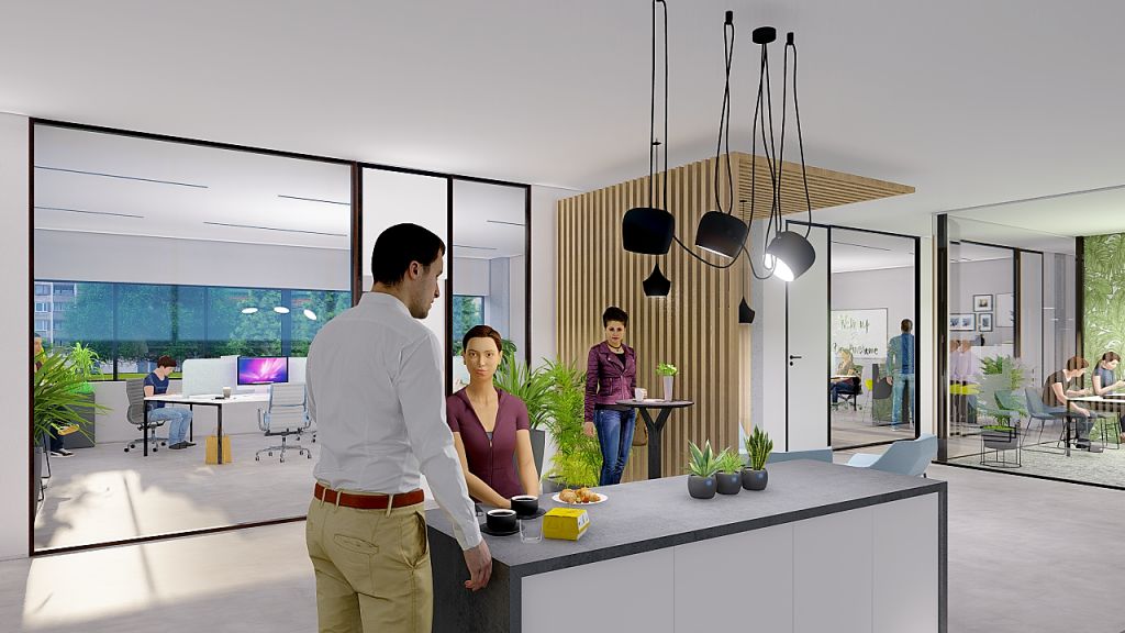 V 1. až 6. patře je přes 40 kanceláří velikosti od 12 m² do 400 m², dostatek zasedacích místností a také střešní terasa vhodná na práci i na večerní party. Nechybí ani dostatek parkovacích míst pro auta i kola.