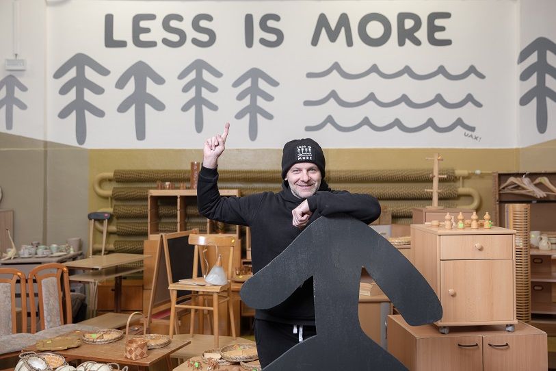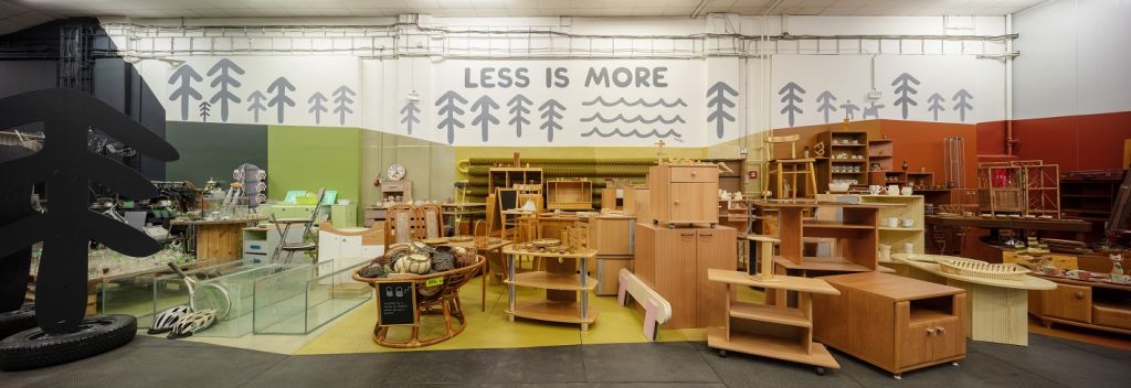 Radek Leskovjan se při návrhu interiéru a jednotné vizuální podoby centra držel hesla „Less is more“. „Tento slogan jsem použil jako centrální sdělení celého prostoru. A doplnil jsem jej dalšími slogany jako Omezuj, Odmítej, Používej, Opravuj, Upcykluj a Recykluj. To se totiž stane, když se spojí zodpovědnost, ušlechtilá myšlenka a design s mým rukopisem,” přibližuje designér.