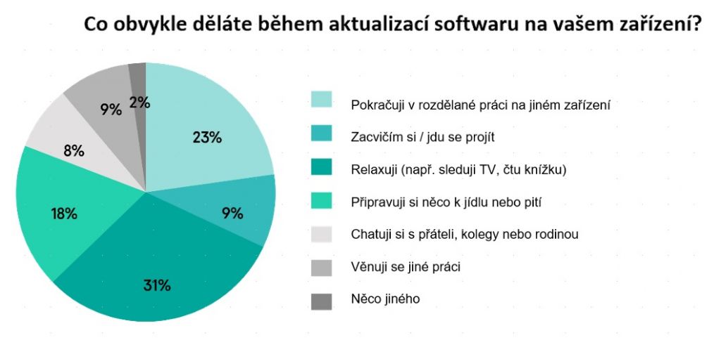 Na tomto závěru se respondenti v zásadě shodují – 40 % z nich uvádí, že se čas nutný pro aktualizace dá využít účelněji, i když to může mít vliv na produktivitu, a 39 % oceňuje, že si může dát při využívání moderních technologií pauzu.