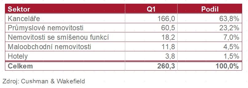 V letošním prvním čtvrtletí na českém trhu převládaly prodeje kancelářských nemovitostí, jež tvořily téměř dvě třetiny celkového objemu, necelou čtvrtinou se pak podílel logistický sektor. Transakce realizovali z poloviny lokální investoři, ze 30 % němečtí a z 20 % singapurští.