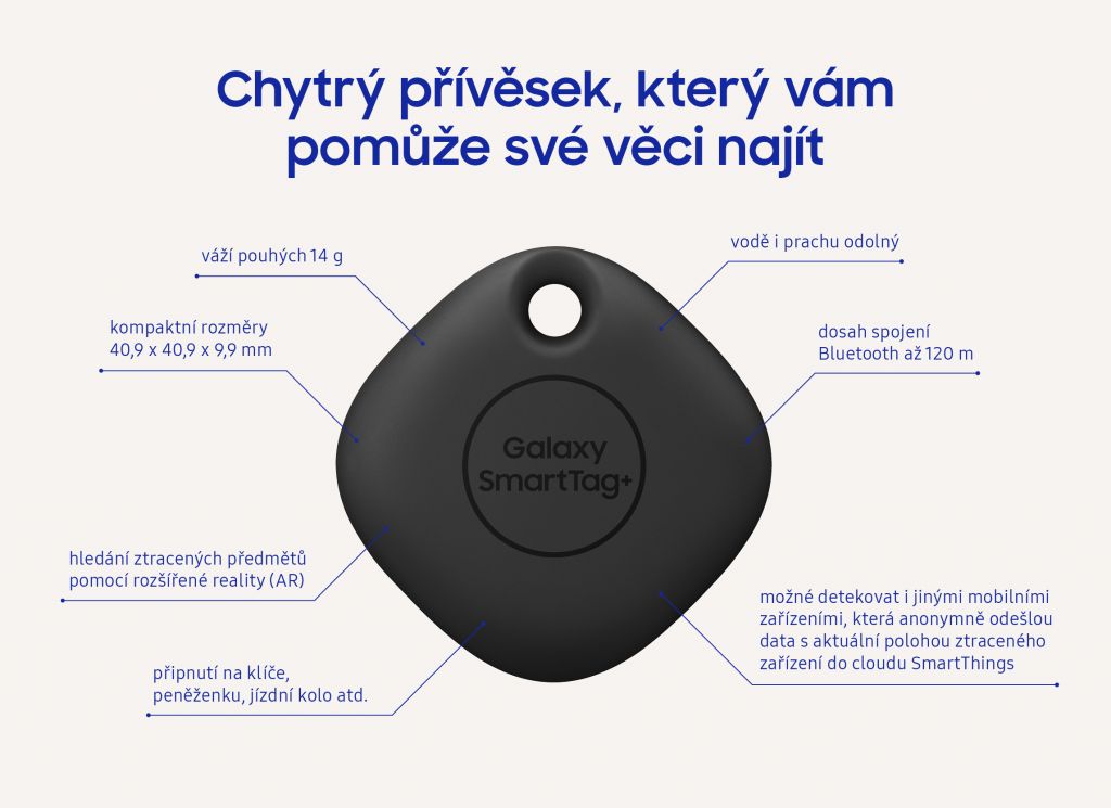 Přívěsky jsou vodě i prachu odolné (IP53) a dosah spojení Bluetooth činí až 120 m. Při propojení se službou SmartThings Find můžete pomocí přívěsku vyhledávat telefon nebo sdílet polohu přívěsku s ostatními. Pomocí Galaxy SmartTag a SmartTag+ lze mít přehled i o aktuální poloze dalších členů domácnosti nebo domácích mazlíčků. „Ztracený přívěsek je možné detekovat i jinými mobilními zařízeními, která anonymně odešlou data s aktuální polohou ztraceného zařízení do cloudu SmartThings a ta se následně zobrazí majiteli SmartTagu,“ doplňuje Tomáš Balík. „Přívěsky můžou sloužit také k ovládání chytré domácnosti a ke spouštění automatizací. Majitel přívěsku například může zmáčknutím či podržením tlačítka v domě rozsvítit světla ještě něž do něj vstoupí.“