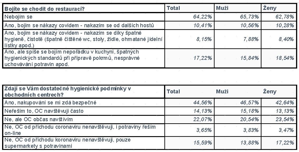 Co se týče obchodních center, jsou zde pro 45 % respondentů hygienické podmínky vyhovující a bez výhrad zde nakupují. 14 % lidí pak hygienu vůbec neřeší a obchodní centra navštěvuje. 41 % Čechů má k úklidu, čistotě a hygienickým podmínkám výhrady. Přesto OC ale 22 % občas navštíví, 16 % zde pravidelně nakupuje potraviny. Zajímavostí je, že opatrnější jsou při nákupech v obchodních centrech ženy, muži mají menší obavy.