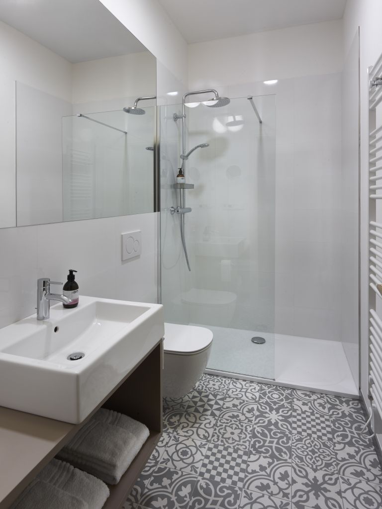 Vzdušné apartmány s vysokými stropy jsou navrženy v neutrálních tónech se zajímavými akcenty, které dodávají celému interiéru lehkost, eleganci a zároveň potřebný rámec pro dotvoření útulného domova v případě dlouhodobých pronájmů. Všechny místnosti se nesou v moderním duchu, přičemž nechybí vybavení základním nábytkem (skříně, dostatečně velký pracovní stůl, postele s kvalitními matracemi), podlahové vytápění, klimatizace, plně zařízená kuchyň včetně mikrovlnné trouby a myčky na nádobí, koupelna se sprchovým koutem, chytrá televize se satelitním přijímačem a neomezené Wi-Fi připojení. Pohodlný a bezpečný vstup do bytů či apartmánů zajišťují čipové karty.