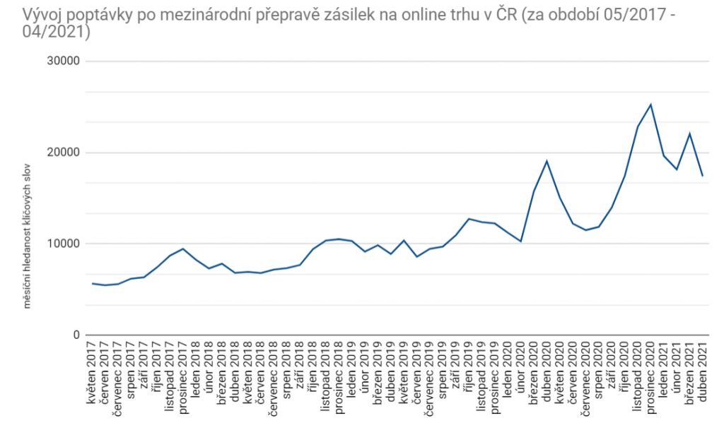 Během posledních čtyř let kontinuálně roste poptávka po zasílání balíčků do zahraničí. Vyplývá to z analyzované množiny 400 slov v jednotlivých měsících. Trend navíc zesílil v době začátku pandemie, březnu 2020. Vrchol tohoto zájmu je každoročně v období Vánoc. Během svátků v roce 2020 zájem dosáhl dokonce 25 250 hledání měsíčně. Byl tedy přibližně o 100 % vyšší, než ve stejné době roku 2019.