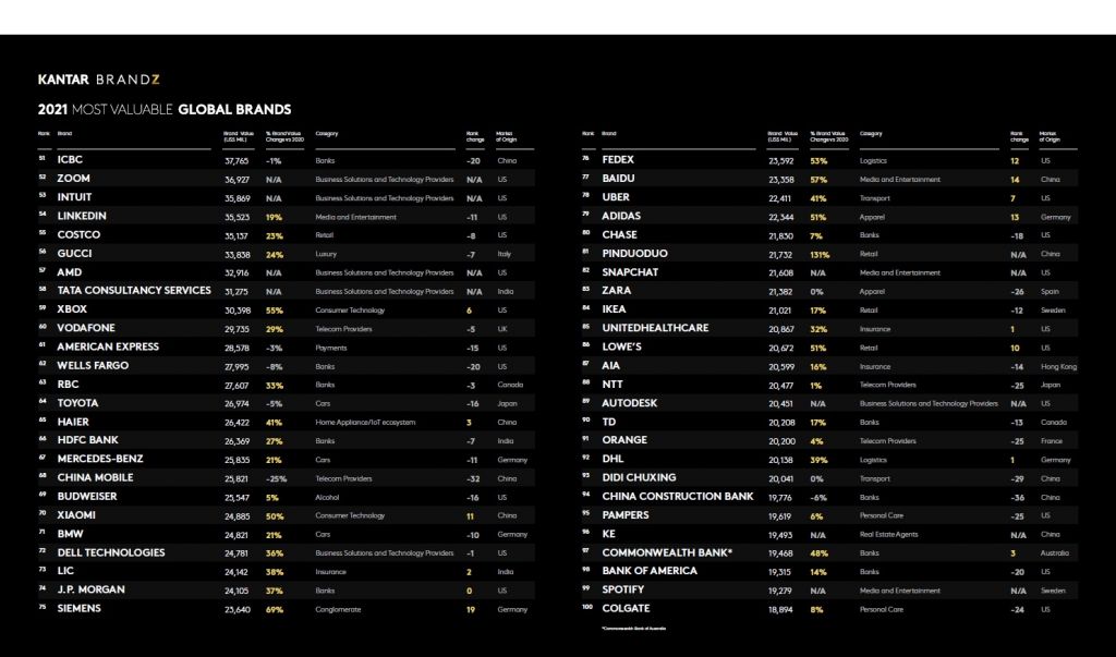 Nejhodnotnější značky světa zaznamenaly rekordní růst, jejich kumulovaná hodnota dosáhla 7,1 bilionů USD, tedy částky srovnatelné se součtem ročního HDP Francie a Německa; vyplývá tak z letošního žebříčku Kantar BrandZTM Nejhodnotnější značky světa 2021. Tento 42% nárůst, který čtyřikrát překračuje průměrný meziroční nárůst v posledních 15 letech tohoto hodnocení, byl podpořen především důvěrou, kterou vyvolává dostupnost vakcín, vládní balíčky na podporu ekonomik a zlepšující se výhledy na HDP. Americké značky představují 56 z celkových Top 100 značek žebříčku, s vedoucími značkami Amazon a Apple, z nichž každá v současnosti dosahuje hodnoty přes půl bilionu USD.