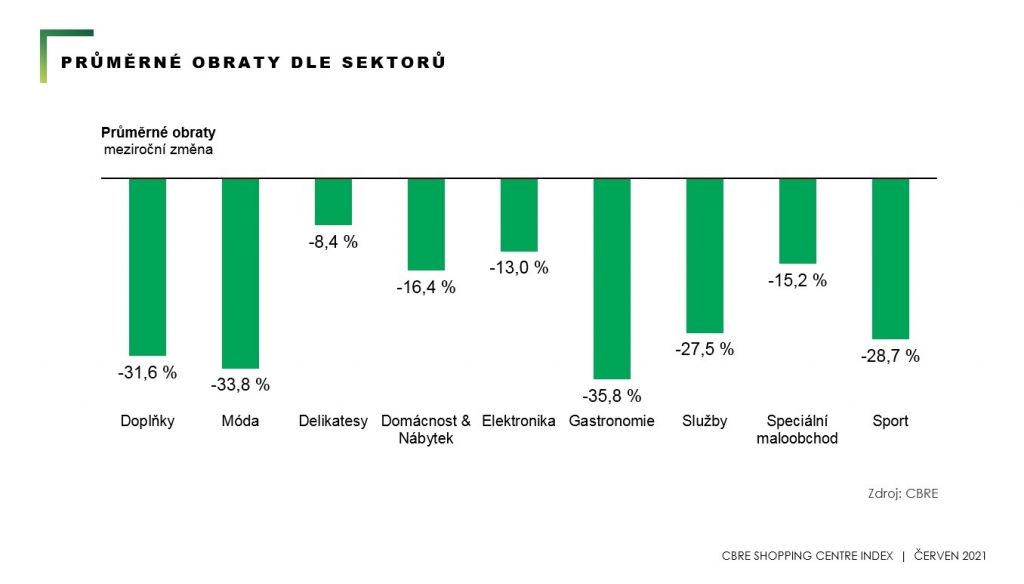 Hodnotíme-li jednotlivé segmenty, nejvíce zasaženým byl provoz gastronomie. Nejdynamičtější sektor posledních tří let, který v minulosti zaznamenával dvouciferný růst, vloni v obchodních centrech meziročně klesl o 36 %. Ovšem s 30% propadem ho následovaly kategorie módy a doplňků. Zde, podobně jako v oblasti prodeje sportovních potřeb, sehrála velkou roli sezónnost. Prodejci totiž neměli kvůli zásobám neprodaných kolekcí dostatek volných finančních prostředků na nákup nových kolekcí.