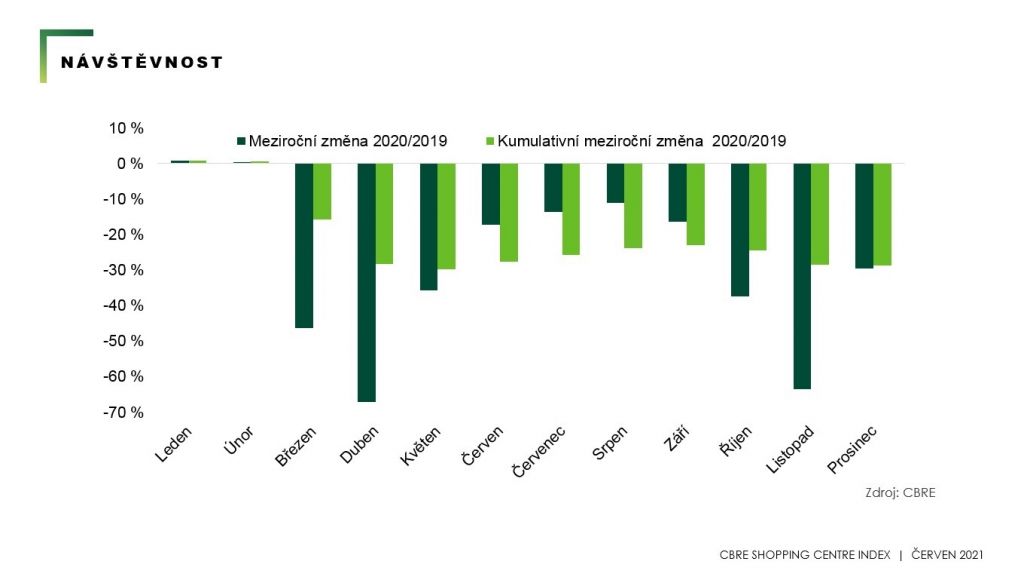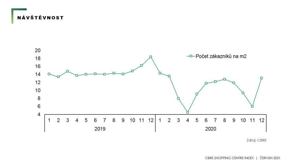 Celková roční návštěvnost v nákupních centrech zastoupených v Shopping Center Indexu překročila v roce 2020 hranici 66 milionů, což představovalo 127 zákazníků na metr čtvereční a meziroční pokles o 29 %. Začátek roku ještě vykázal podobnou dynamiku jako v předchozích letech, nicméně uzavření obchodů a služeb během prvního lockdownu způsobilo fatální pokles návštěvnosti. Ta byla v dubnu o 67 % menší než v roce 2019. V květnu, kdy proběhlo postupné rozvolňování, se situace o něco zlepšila, ale i přesto se návštěvnost pohybovala na hodnotách o 15 až 20 % nižších než předchozí rok. Důvodů bylo několik: neochota lidí navštěvovat veřejné prostory, ochranná opatření, obavy z blížící se recese a také zvýšená poptávka po online nakupování. Během letních měsíců se však návštěvnost vyvíjela rostoucím trendem a v druhé polovině srpna dokonce dosahovala takřka podobné úrovně jako v roce 2019. Poté ale přišla druhá vlna, kdy se velká část obchodů a služeb znovu uzavřela, což mělo za následek v listopadu 2020 meziroční pokles návštěvnosti o 63 %. V prosinci se obchody znovu otevřely, nicméně očekávání ohledně vánočních nákupů se nenaplnila a návštěvnost zůstala o 29 % nižší než o rok dříve. Po vánočních svátcích došlo k dalšímu tvrdému lockdownu, který až na výjimky trval do letošního května.