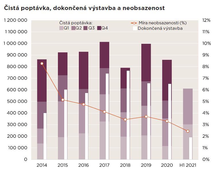 Po rekordních výsledcích v prvním čtvrtletí 2021 nájemní aktivita ve druhém čtvrtletí zpomalila a dosáhla 462 500 m², což je stále o 13 % více než ve stejném období loňského roku a 16 % nad průměrem za předchozích dvanáct čtvrtletí. Čistá poptávka nepatrně (o 2 %) překonala aktivitu evidovanou v prvním kvartále a ve druhém čtvrtletí roku 2021 dosáhla 307 800 m². Meziročně se jednalo o 29% nárůst a ve srovnání s druhým čtvrtletím roku 2019 (před pandemií) se poptávka zvýšila o 21 %. Ve druhém čtvrtletí tvořily předpronájmy 60 % čisté poptávky, a 58 % čisté poptávky celého prvního pololetí 2021, což bylo výrazně nad průměrem za předchozích dvanáct čtvrtletí (53 %).