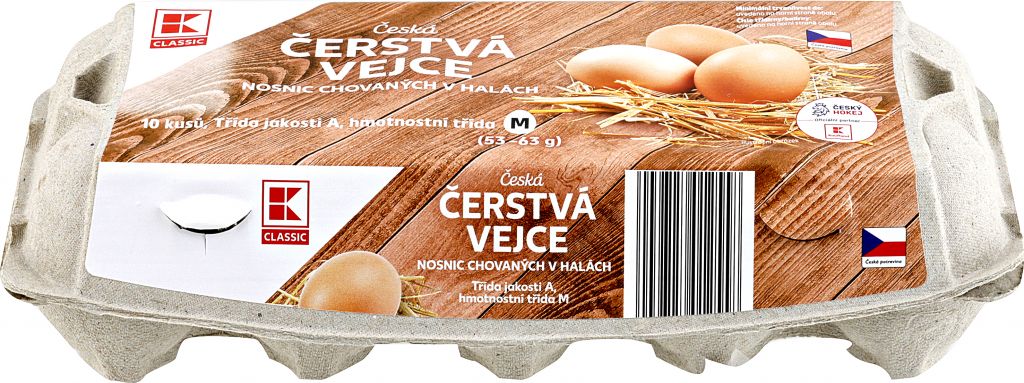 Kaufland nabízí široký výběr vajec – ve stálém sortimentu primárně česká výjimečně slovenská a v akční nabídce se pak objevují i zahraniční vejce. Zákazník může vybírat z různých velikostí a typů chovů – od oblíbených podestýlkových vajec (značených číslem 2), vejce od slepic z volného výběhu (1), po BIO vejce (0). Novinky – vejce z volného výběhu K-Jarmark jsou nabízena ve velikosti M v balení 6 ks a podestýlková K-Classic aktuálně ve 2 typech balení – M10 (M značí velikost a číslovka počet kusů v balení) nebo L6, ale připravují se také zvýhodněná velká balení M20 a M30, všechna pouze od českých nosnic.