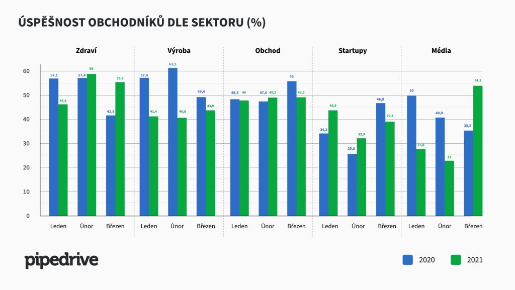Nejlepších výsledků v prvním kvartálu 2021 dosahují čeští obchodníci v oblastech zdravotnictví (53 %), výroby (42 %) a obchodu (49 %). Dobře si vedly rovněž technologické startupy (38 %) a média (35 %). Ve stejném období loňského roku byla úspěšnost v sektoru zdravotnictví průměrně 52 %, ve výrobě 56 % a v oblasti obchodu 51 %. Právě segment výroby byl totiž pandemií nejvíce zasažen. Obchodníci v oblasti technologických startupů pak dosahovali úspěšnosti 36 % a v médiích dokonce 42 %.