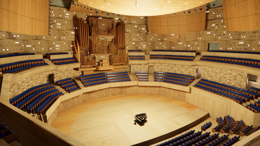 Lze připomenout, že základní výsledná podoba koncertního sálu je známa od července 2019, kdy byly vyhlášeny výsledky největší architektonické soutěže v novodobé historii města, připravované již od roku 2017. Autory vítězného návrhu jsou studia Steven Holl Architects z New Yorku a Architecture Acts z Prahy. Aktuálně na projektu spolupracuje zhruba 70 odborníků, kteří architektonický návrh rozpracovávají do nejmenšího detailu, od zakládání stavby a statiky, přes akustické parametry až po detaily interiérových prvků. Stavba, jež Ostravu pevně zakotví na mapu světové architektury, je unikátní v mnoha směrech. Nabídne komplexní hudební, kulturní, produkční i vzdělávací zázemí. Snoubí se v ní přitom unikátní architektonické řešení, osobitý styl, nejmodernější technologie, současně však také citlivě naváže na odkaz architekta Jaroslava Fragnera, neboť propojí památkově chráněný objekt s nadčasovou novostavbou