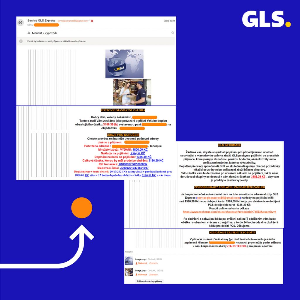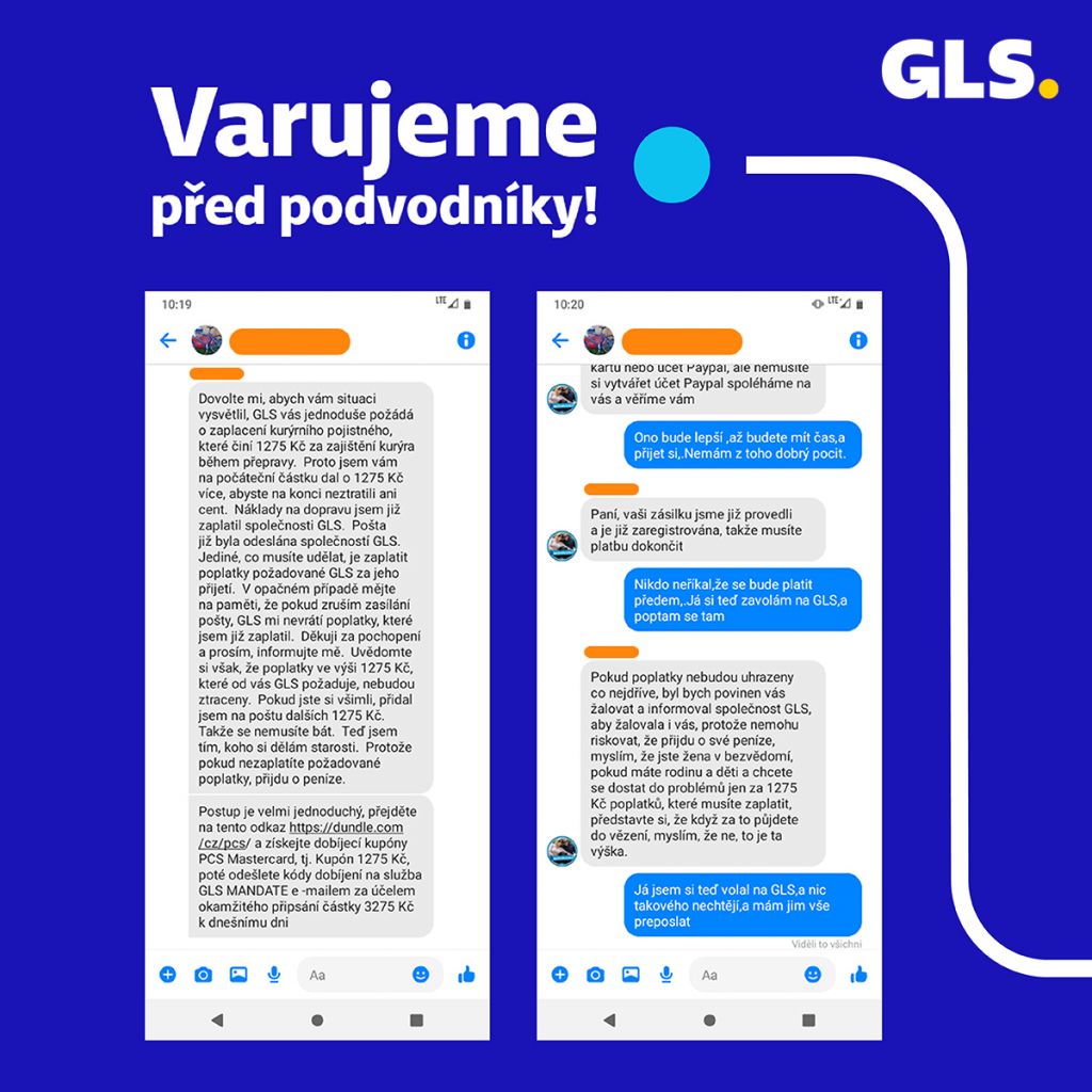 GLS v emailové, SMS komunikaci nebo komunikaci na sociálních sítích nikdy nezasílá výzvu příjemci k úhradě jakékoliv částky před samotným doručením zásilky. Příjemce hradí v okamžiku doručení pouze případnou dobírkovou částku, a to vždy kurýrovi GLS platební kartou nebo v hotovosti. V případě nejasností či podezření by se zákazníci měli obrátit na zákaznický servis GLS: info@gls-czech.com.