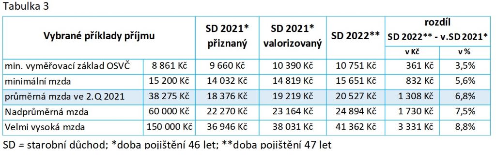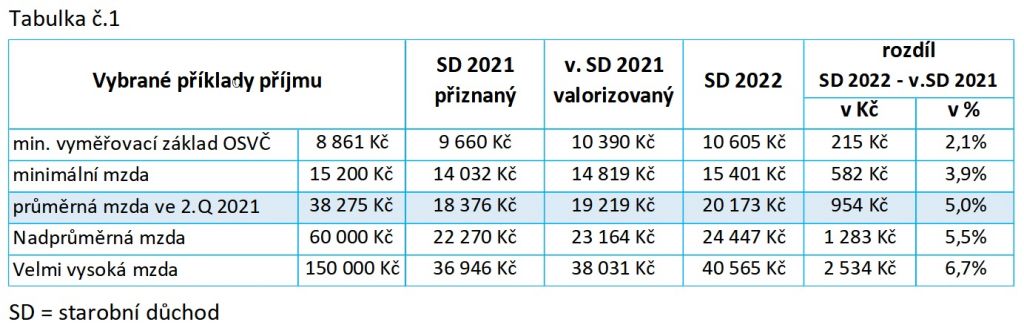 V tabulce č.1 je uvedeno pět příkladů reálných pojištěnců, kterým vznikl nárok na starobní důchod v posledním čtvrtletí roku 2021. Výsledky jasně potvrzují dříve uvedená fakta. „Ve všech uvažovaných případech by byl starobní důchod přiznaný v roce 2021 i po následné valorizaci nižší než starobní důchod přiznaný v roce 2022. Navíc, s rostoucí výší důchodu rozdíl mezi oběma důchody roste,“ popisuje Jiří Šafařík.