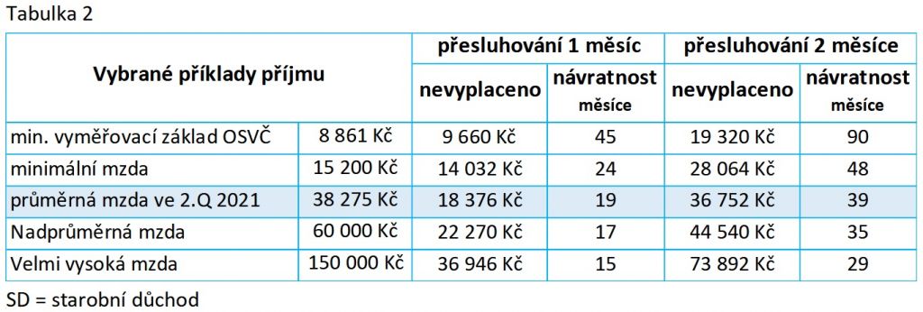 Pro lepší představu, kdy se tato „ztráta“ vykompenzuje výplatou vyššího důchodu, jsou v tabulce č.2 názorně uvedeny jednotlivé příklady doby návratnosti této „ztráty“ při posunutí data přiznání důchodu o jeden nebo dva měsíce (platí pro případy, kdy přesluhováním nedojde k získání dalšího roku pojištěni, jak je uvedeno v závěru článku; viz tabulka 3).