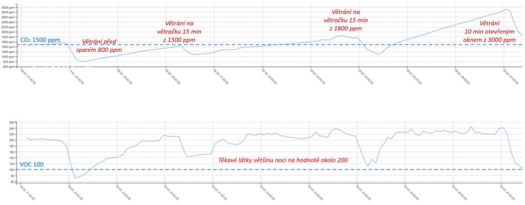 „Zcela běžně například koncentrace oxidu uhličitého v noci stoupala přes 3 000 ppm (graf 1) oproti doporučené hodnotě pro vnitřní prostředí 1 500 ppm: čtyřčlenná rodina tuto normovou hodnotu překonala (v nevětraném pokoji o velikosti cca 30 m²) již za 1,5 hod, dvě děti ve svém 10metrovém pokoji pak za 2,5 hod. (graf 1). A spolu s tím rostla i teplota a koncentrace potenciálně karcinogenních těkavých látek (graf 2), jež se následně držela na extrémně vysokých hodnotách – přesahovala hranici 200, která je zdraví škodlivá. Maximální doporučená hodnota pro index VOC v interiérech je 100.“