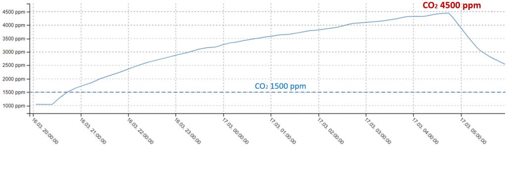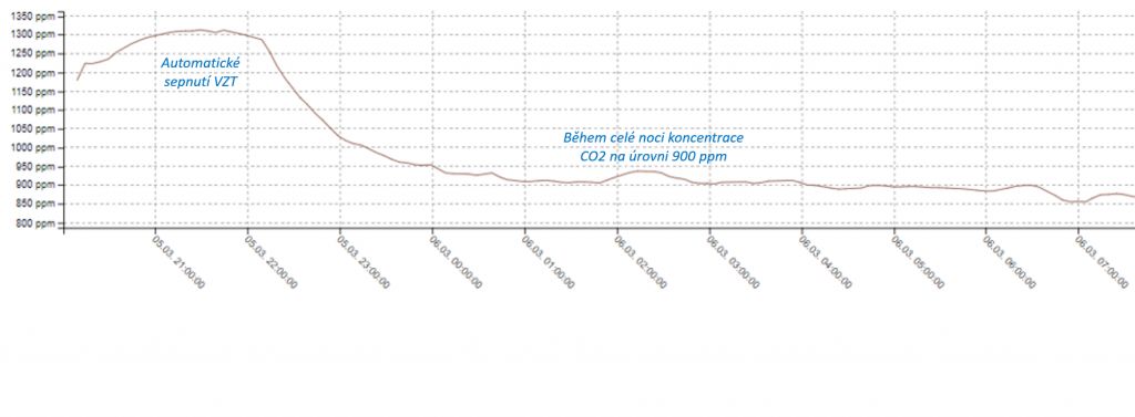 Měření v bytě s řízeným větráním, které ovšem bylo vypnuté, ukázalo, že při spánku matky s dítětem v ložnici o ploše 12 m² se zavřenými okny a dveřmi hodnota ppm vystoupala již za první hodinu o 100 % a do rána téměř atakovala kritickou hranici 5 000 (graf 3). Naopak měření v bytě se zapnutým řízeným větráním s rekuperací tepla prokázalo, že hodnota CO2 se po celou noc v pokoji se dvěma spícími dětmi pohybovala s rezervou pod normovou hranicí 1 500 ppm (graf 4).