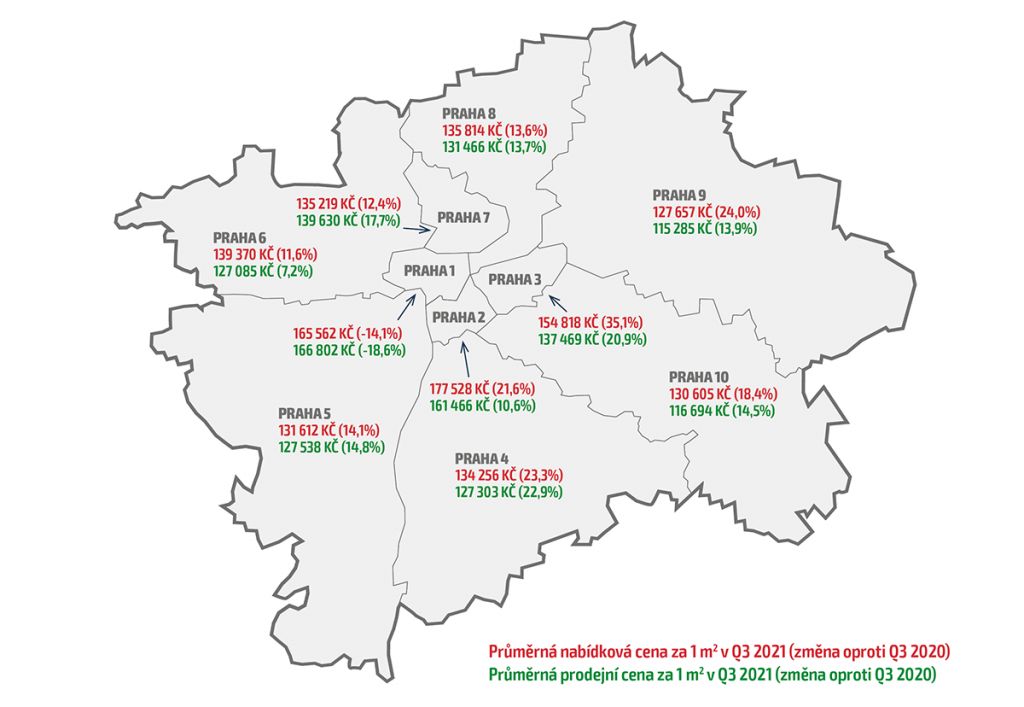 Za nejvyšší ceny se nabízely byty na Praze 2 (přes 177 tisíc Kč za m²), za nejnižší na Praze 9, která zůstává jedinou pražskou čtvrtí s nabídkovou cenou pod 130 tisíc Kč za metr čtvereční. Praha 10 nabízí byty průměrně za 130,6 tisíce Kč za čtvereční metr. Na Praze 1 se byty průměrně nabízely za 165,6 tisíce Kč za m². Přestože jde o druhou nejvyšší nabídkovou cenu po Praze 2, zůstává pražské historické centrum jediným obvodem, kde meziročně poklesla cena za metr čtvereční. V centru bylo ovšem pouze 12 volných bytů v nabídce, tedy nejméně ze všech městských obvodů. Největším skokanem se stal třetí pražský obvod, kde byl zahájen prodej i luxusnějších a dražších projektů.