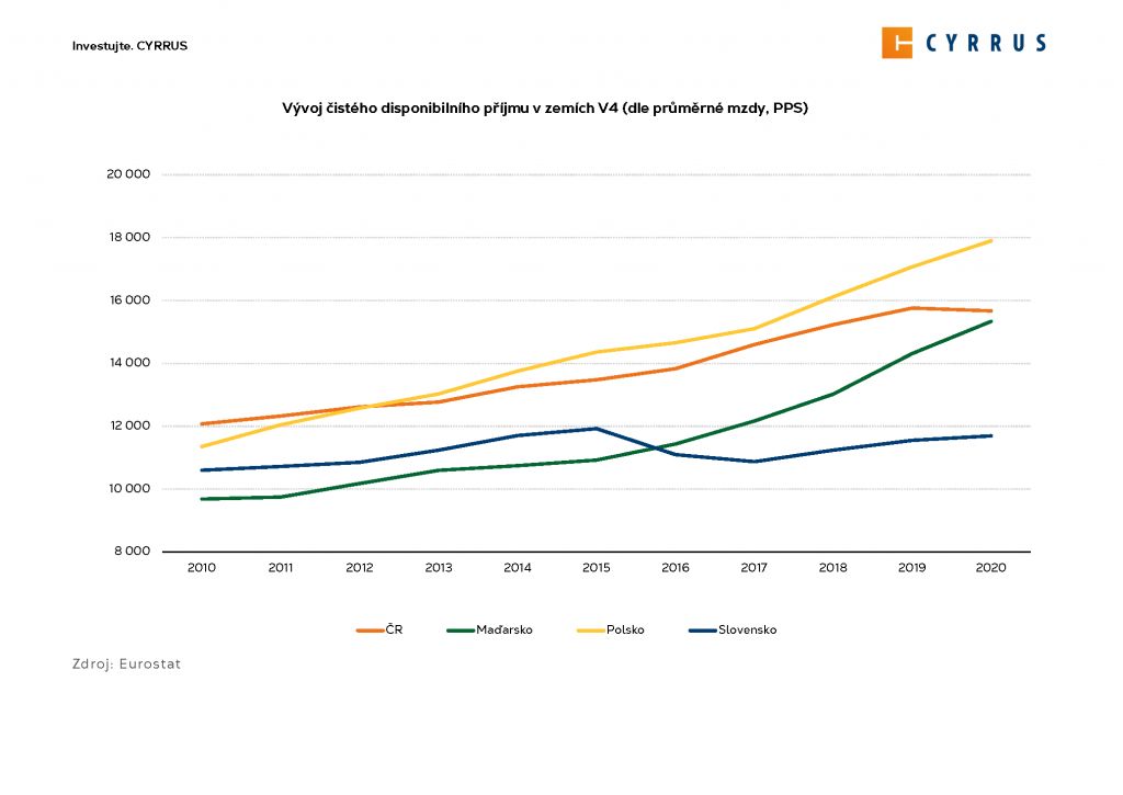 Druhou stranou mince ke změnám průměrné hrubé mzdy jsou disponibilní příjmy, které představují příjmy jednotlivce očištěné o daně a další odvody, jež musí zaměstnanci platit. V České republice vzrostl za posledních deset let čistý disponibilní příjem o 29,8 %, což je výrazně nad průměrem zemí eurozóny (16,1 %). Mnohem více než Češi si však přilepšili obyvatelé Polska, kterým za poslední dekádu vzrostl čistý disponibilní příjem o téměř 60 %. Podobně rychlé tempo zaznamenali také Maďaři. Naopak na Slovensku byl růst čistého disponibilního příjmu dokonce pod průměrem eurozóny a dosáhl jen 10,3 %, což odpovídá tempu růstu o 1 % p.a.