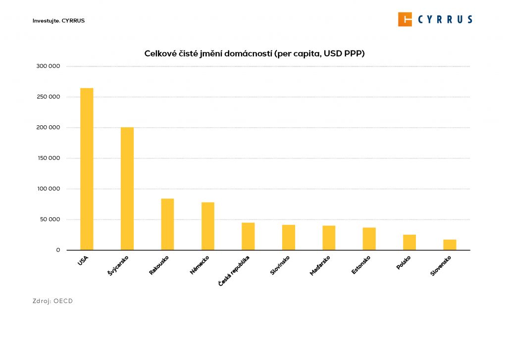 Bohatství domácností se částečně odvíjí od mezd, ale přestože jim mohou přilepšit, nejsou tím, co bohatství tvoří. To je totiž tvořeno všemi aktivy, které jednotlivci vlastní – jako je hodnota nemovitostí, finanční aktiva, spoření a další. Dle ukazatele celkového čistého jmění si ve srovnání se sousedními státy nevedeme vůbec špatně, dokonce jsme bohatší než většina zemí střední a východní Evropy. Nicméně oproti západním zemím lze vidět markantní rozdíl v celkovém čistém jmění domácností – ve srovnání s nejbližšími sousedy Rakouskem a Německem však není tak výrazný jako v případě Spojených států nebo Švýcarska, kde je rozdíl v bohatství oproti Česku více než čtyřnásobný.