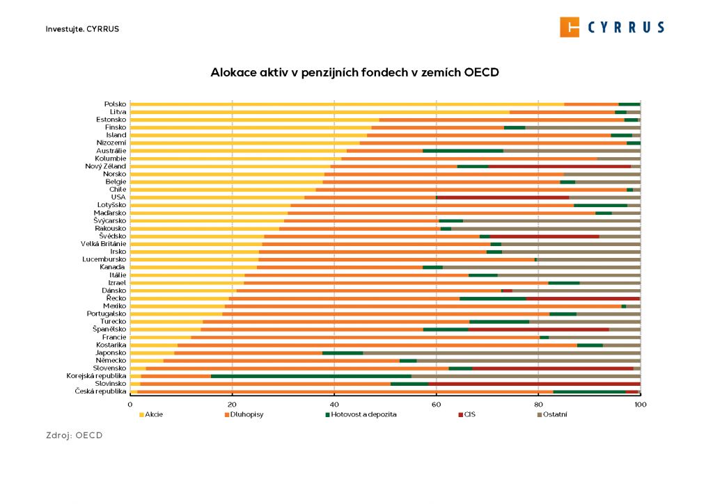 A jak je to vlastně s penzijními fondy a zajištěním na stáří? Podle výše uvedeného grafu v Česku tvoří penzijní fondy v průměru 6,2% podíl na finančních aktivech – výrazně méně, než je tomu v okolních státech. Penzijní fondy tak nepatří mezi oblíbené investiční nástroje, což je dáno jejich konzervativní investiční strategií, kdy 81,5 % aktiv fondů je tvořeno státními dluhopisy2. Tyto nástroje lze díky jejich složení považovat za bezpečnější, nicméně z pohledu investora a střadatele za prakticky neatraktivní.