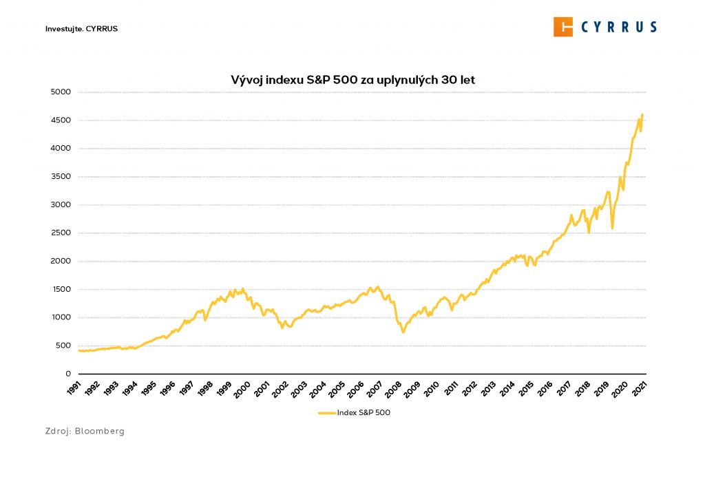 o průměrné roční zhodnocení 7,8 % (když opět zohledníme dividendy tak o 11 %). A to v průběhu tohoto období potkalo akciové trhy několik krizí, ať už šlo o americkou ropnou krizi a stagflaci v 70. letech, technologickou bublinu v roce 2001, finanční krizi v roce 2008 nebo poslední propad z jara roku 2020. Přes všechny tyto krátké nepříznivé epizody jsou z dlouhodobého pohledu akciové trhy rostoucí a schopny přinášet nejvyšší možné výnosy. Podobné zhodnocení přinášejí také evropské akcie (měřeno indexem Euro Stoxx 600 se zohledněním dividend) – za posledních 30 let to bylo v průměru 8,1 % p.a.