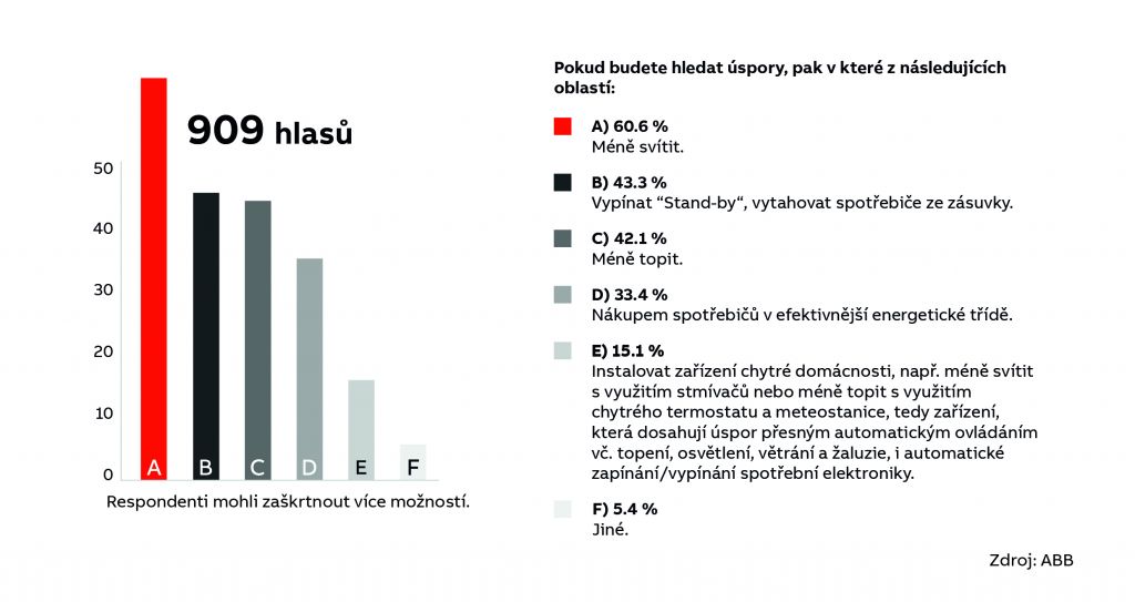 Většina občanů ČR bude reagovat na letošní výrazný růst cen energií. Významná část (46 %) si myslí, že se jedná o dlouhodobý jev, za krátkodobý výkyv považuje zdražení 22 %. Kromě okamžitých úspor omezením svícení (61 %), vypínáním dalších spotřebičů (43 %), omezením topení (42 %) lidé chystají i dlouhodobější opatření. Patří mezi ně i přechod na úspornější spotřebiče (33 %) a zavedení komplexních úspor formou chytré domácnosti (15 %). Ta zahrnuje instalaci takových prvků, jako jsou stmívače nebo chytré termostaty s meteostanicí, tedy zařízení, která dosahují úspor přesným automatickým ovládáním topení, osvětlení, větrání a žaluzií i automatickým zapínáním a vypínáním spotřební elektroniky.
