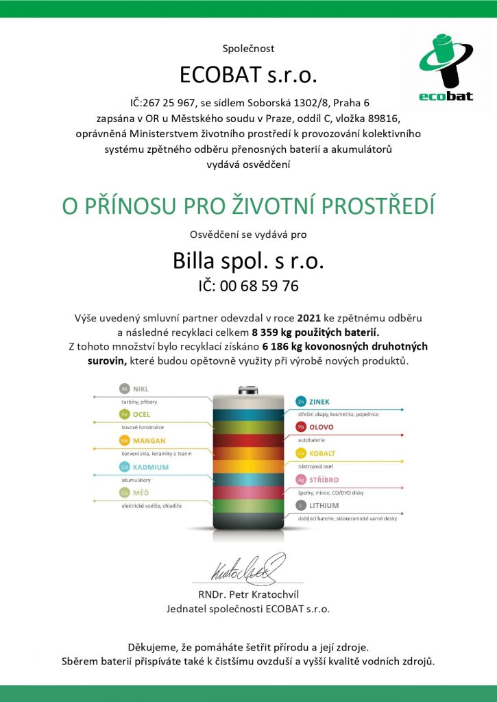 Společnost BILLA se v loňském roce už po devatenácté zapojila do sběru použitých baterií ve spolupráci s neziskovou organizací ECOBAT a pomohla tak vybrat celkem 8 359 kg baterií. Z vybraného množství bylo následnou recyklací získáno 6 186 kg kovonosných druhotných surovin, které výrobci opětovně využijí pro nové produkty. Celkové množství vybraných baterií se každým rokem navyšuje a minulý rok se zařadil dokonce mezi rekordní.