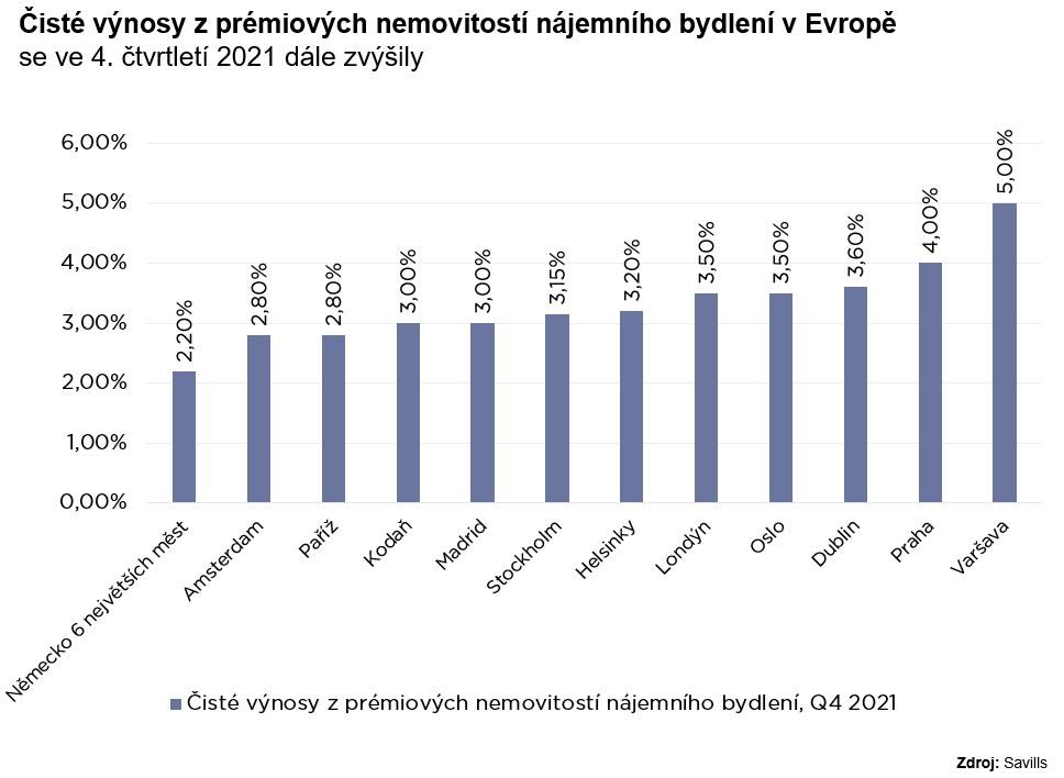 Průměrný výnos z prémiových nemovitostí nájemního bydlení v západní Evropě se v roce 2021 meziročně snížil o 7 bazických bodů (bps) a dosáhl rekordního minima 3,05 %. Čisté výnosy z prémiových nemovitostí vícegeneračních domů jsou 3 % nebo nižší v šesti největších německých městech (2,2 %), Amsterdamu, Paříži (2,8 %), Kodani a Madridu (3,0 %). Čistý výnos z prémiových nemovitostí v Praze činí 4 %.