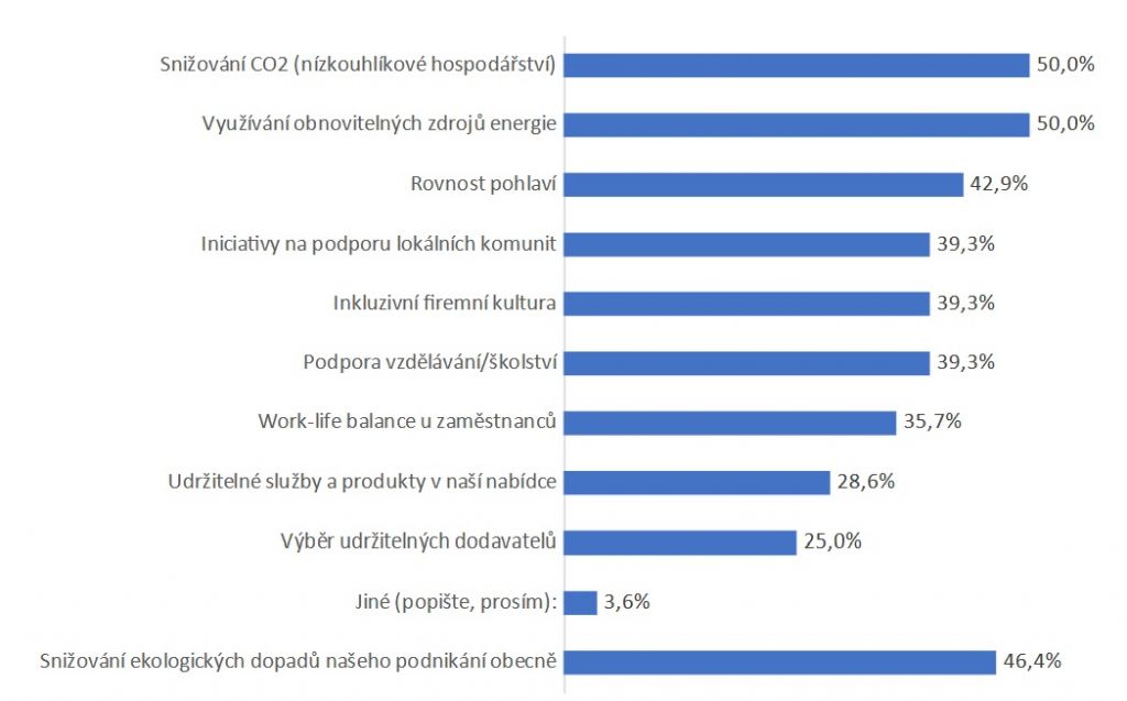 Nejvíce napříč firmami rezonují nepřekvapivě témata spojená s ekologií. Firmy již dnes běžně zajišťují ekologické nakládání s odpady, snižují emise uhlíku a podporují využívání obnovitelných zdrojů. Současné energetická krize a s ní související růst cen energií je dnes tématem pro všechny firmy v České republice. Pokud se firma snaží ušetřit na energiích, je z dlouhodobého hlediska nejvýhodnější zainvestovat do ekologičtějších zdrojů energie.