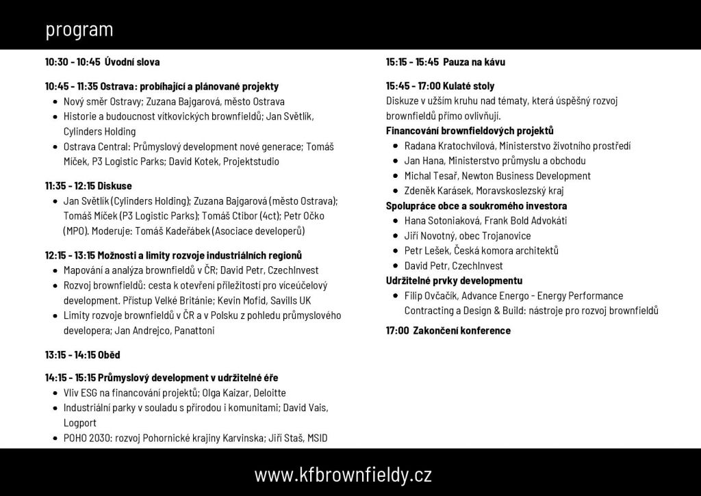 Dopolední program konference představí ostravské brownfieldové projekty. Vzhledem k množství investic, které město plánuje nebo již realizuje, se přístup Ostravy k územnímu rozvoji stává inspirativním příkladem. Prezentovány budou i projekty soukromých investorů, například průmyslově-obchodní areál P3 Ostrava Central vznikající na místě bývalé surovinové skládky v centru Ostravy, nebo regenerace haldy Hrabůvky ve vodíkovou čtvrť. Plán na revitalizaci území pohornické krajiny (zkráceně POHO) mezi městy Havířov, Orlová a Karviná, kde ještě stále v omezené míře probíhá těžba, je jedním ze strategických transformačních projektů Moravskoslezského kraje. Důrazem na kvalitu, environmentální udržitelnost a inovativní technologie v oblasti energetiky představuje kýženou budoucnost bývalého uhelného regionu. „Moravskoslezský kraj se může stát leaderem v inovativním přístupu k revitalizaci brownfieldů i k energetice. Využití vodíku v Ostravě již není pouze teorií, ale je krůček od reálných projektů. Operační program Spravedlivé transformace, který do regionu přinese 18,9 mld. Kč, může tomuto typu projektů výrazně pomoci k realizaci,“ dodává Kateřina Kubizňáková, organizátorka konference.