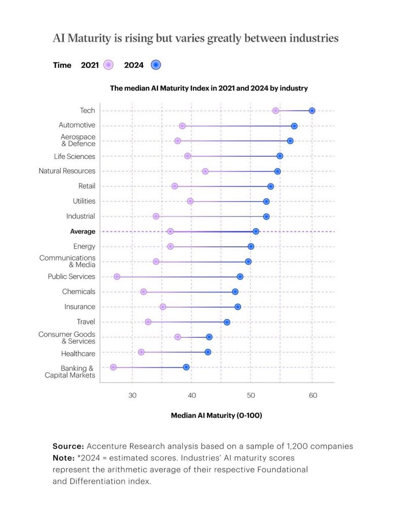Zpráva se závěry průzkumu s názvem “The art of AI maturity: Advancing from Practe to Performance ” představuje strategie, které umožní společnostem využít umělou inteligenci pro získání konkurenční výhody. Součástí zprávy je také index, který na stupnici 0-100 ukazuje vyspělost dané společnosti ve využívání umělé inteligence. Vyspělost ve využívání AI je určena mírou, s jakou jsou společnosti schopny využít AI pro významné odlišení od svých konkurentů. Klíčové jsou jak technické dovednosti využívání samotných technologií (například AI či cloud), tak i související businessové parametry jakými jsou organizační strategie, firemní kultura, zodpovědné využívání umělé inteligence či potřebná podpora ze strany vrcholového vedení. Podle tohoto indexu je medián vyspělosti AI u většiny organizací na skóre 36 bodů, většina tak má velký prostor pro zlepšení.