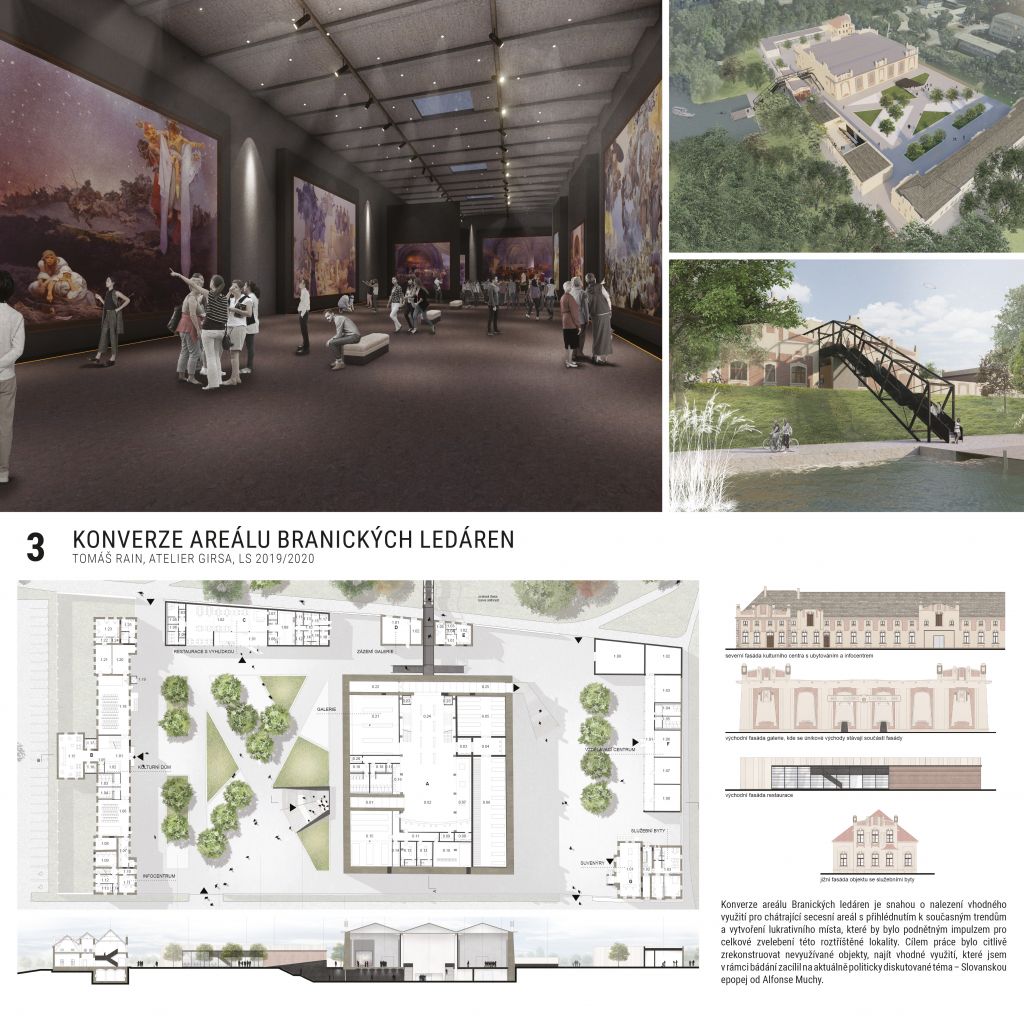Také mezi dalšími umístěnými se nacházejí zajímavé návrhy, například konverze areálu Branických ledáren navržená Tomášem Rainem, který chytře přizpůsobuje významný památkový areál funkci trvalé expozice Muchovy Slovanské epopeje. Seznam všech oceněných projektů je uveden ve stručném výčtu, vizualizace prací jsou pak přílohami tiskové zprávy.
