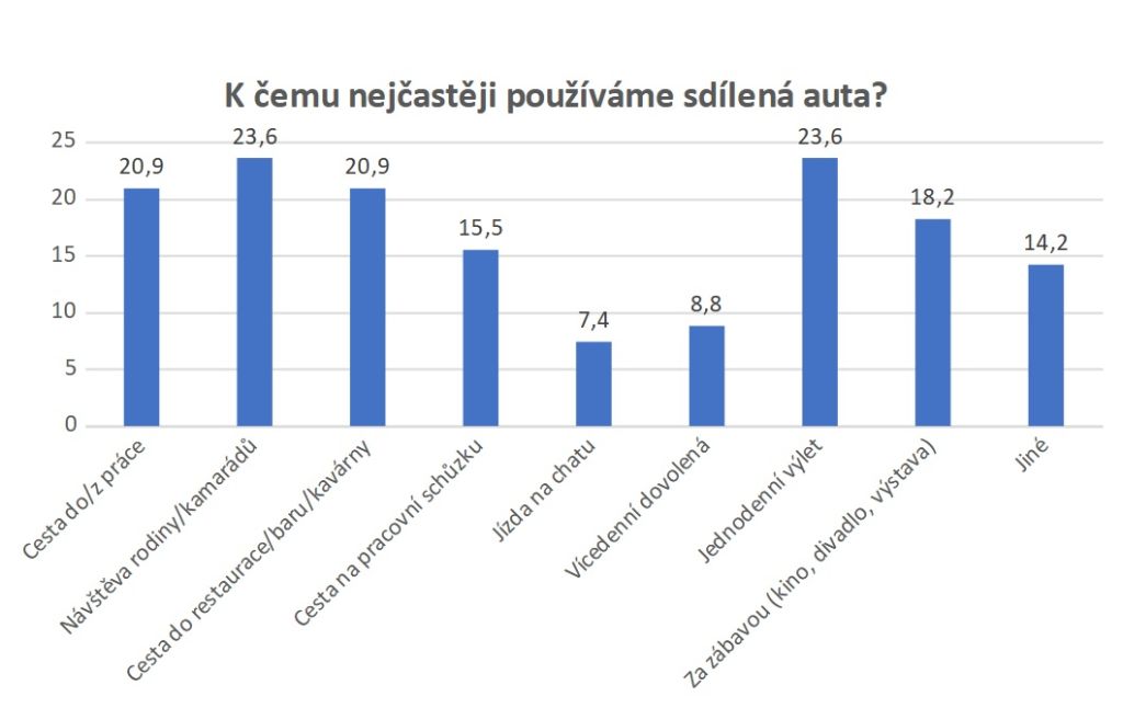 Co se týče využívání, pak nejčastěji je to pro jednodenní výlety (23,6 %) a k návštěvě rodiny nebo kamarádů (23,6). K cestám do práce a z práce či do restaurace, baru nebo kavárny využívá sdílená auta shodně 20,9 %. Pozadu nezůstávají ani cesty za zábavou a do kina, divadla nebo na výstavu, kdy jede sdíleným vozem 18,2 %. Časté jsou také pracovní cesty, kdy k cestám na pracovní schůzky je využívá 15,5 %. Tedy ke zcela běžným věcem, stejně jako automobil, který vlastní.