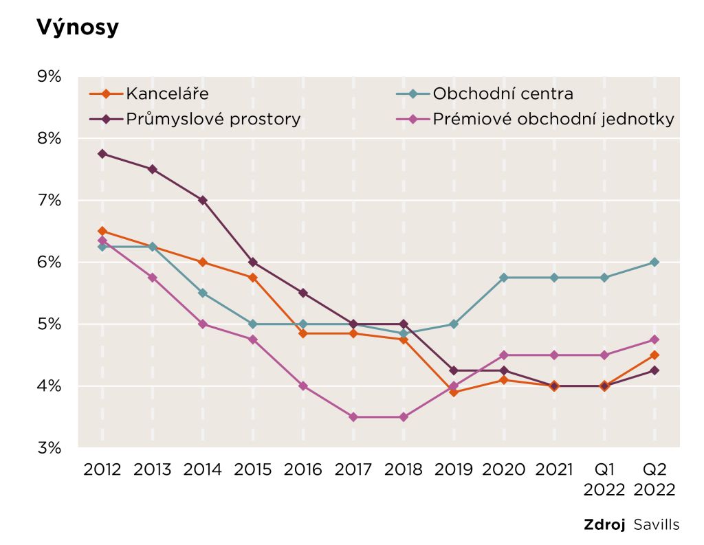 Nálada investorů reagující na bezrizikovou míru výnosnosti způsobuje, že se začínají zvyšovat výnosové míry u všech typů komerčních nemovitostí. U prvotřídních kanceláří došlo ve druhém čtvrtletí 2022 ke zvýšení yieldu (výnosnosti) o 50 bps na průměrnou hodnotu 4,50 %. V průmyslovém a rezidenčním segmentu se výnosnost aktiv posunula o 25 bps výše na úroveň 4,25 %. Stejný nárůst můžeme sledovat i v oblasti maloobchodních nemovitostí. Na trhu již delší dobu neproběhla referenční transakce, ale odhadované výnosy u nejúspěšnějších nákupních center v Praze se pohybují kolem 6,00 % a u prémiových obchodních jednotek kolem 4,75 %.