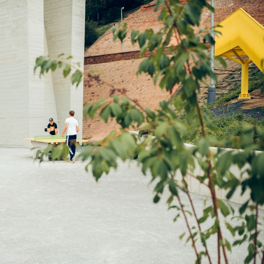 „Dalším zajímavým materiálem je probarvený beton. Barevná směs je v tomto případě přimíchávána do betonu už při procesu jeho výroby a díky tomu se barva nesmývá a neseškrabuje ani při velkém zatížení, jaké představuje například jízda na skateboardu. Kiosek s občerstvením a veřejné WC byly zhotoveny jako dřevostavby, které jsou obloženy cementotřískovými deskami a latěmi z materiálu ThermoWood®, který jsme zvolili především pro jeho barevnou stálost a vysokou odolnost,“ vysvětluje Jana Mastíková.